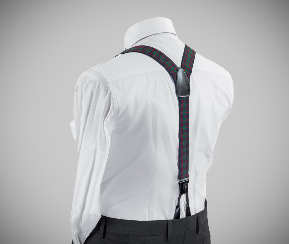 "Elegant, adjustable-size braces, 35mm width, made with fine, resilient material, in a green-red squared fancy-finishing. Metal chrome clip and leather-strap button fasten, included."