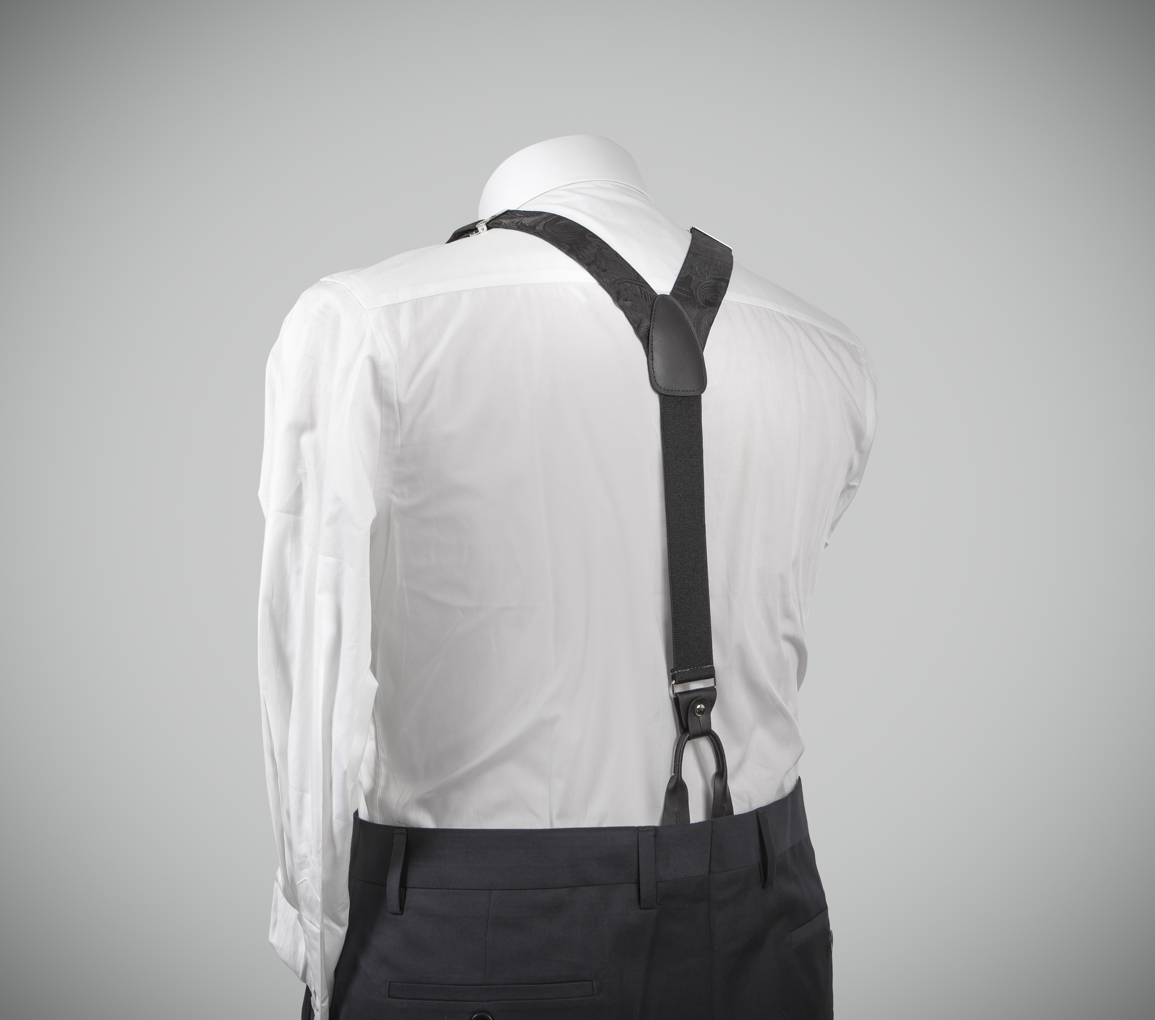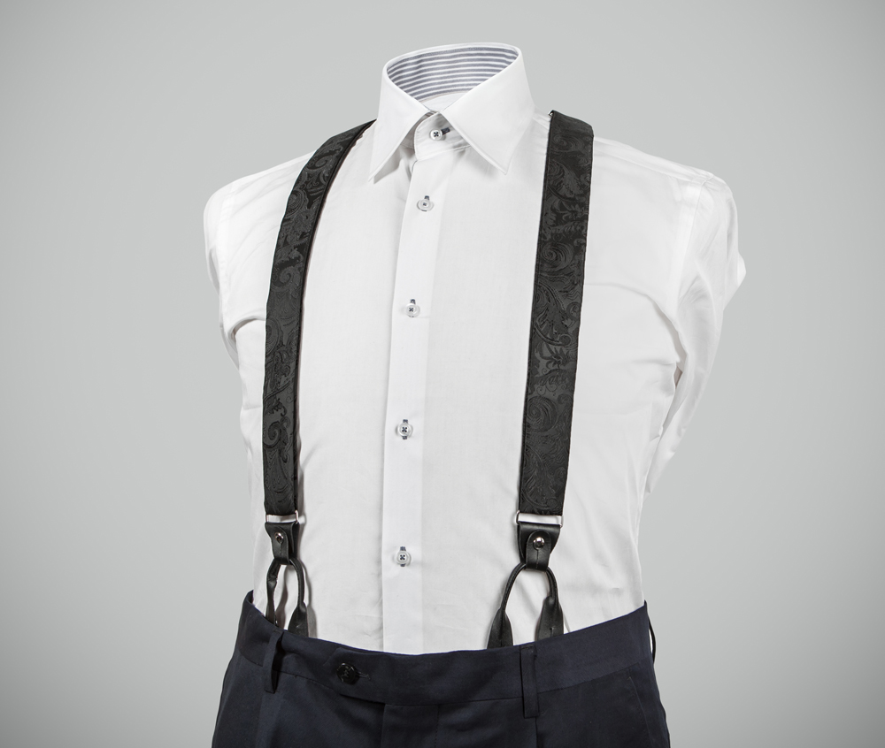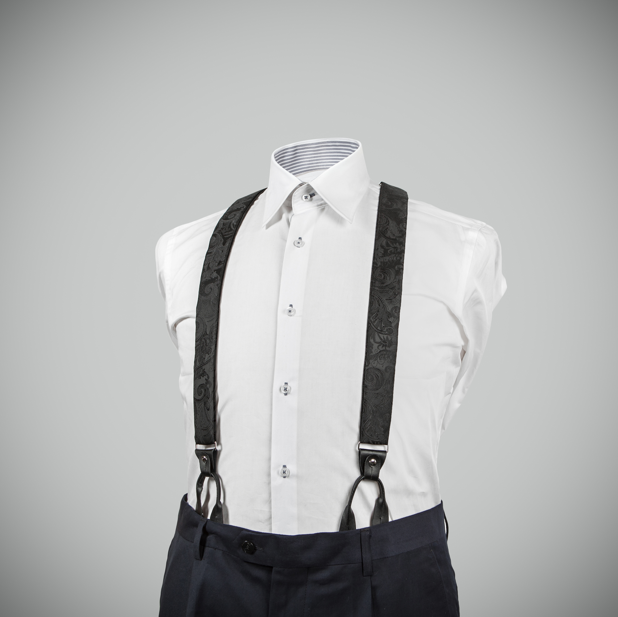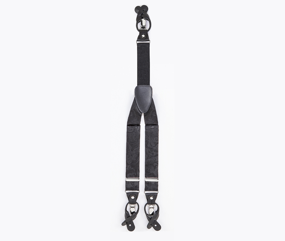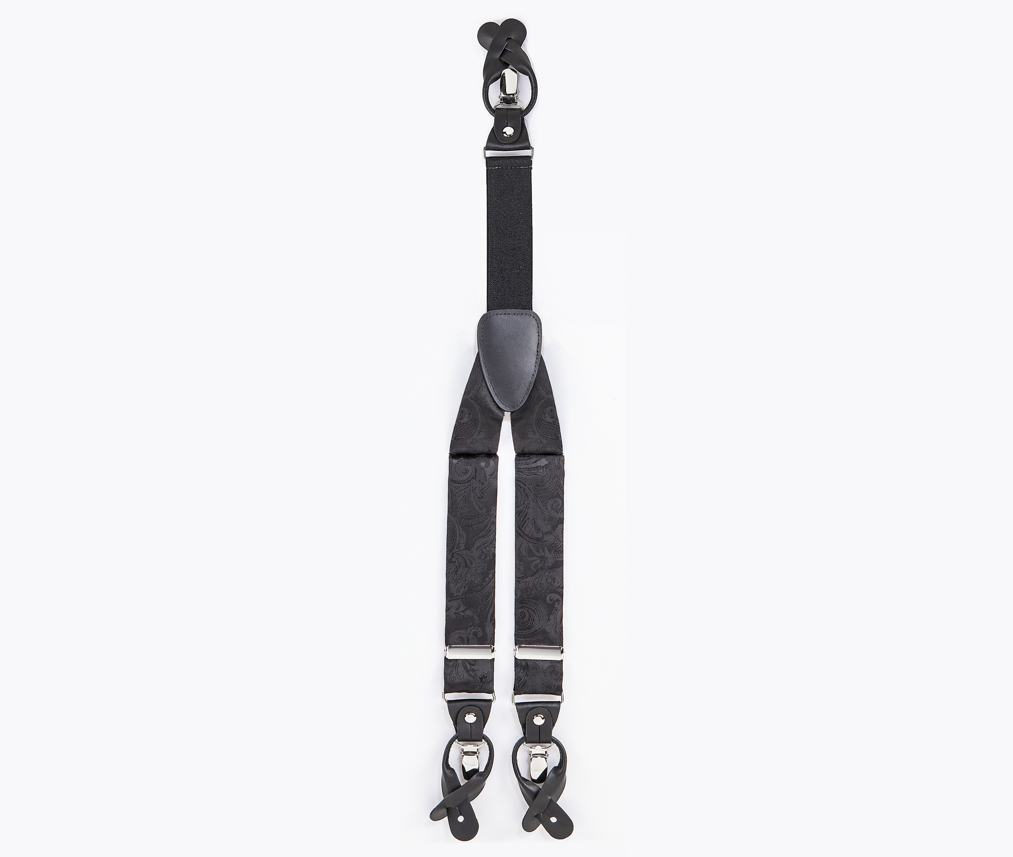 "Elegant, adjustable-size braces, 35mm width, released in exquisite micro woven, black colour, with a lovely paisley-finishing. Metal chrome clip and leather-strap button fasten, included."