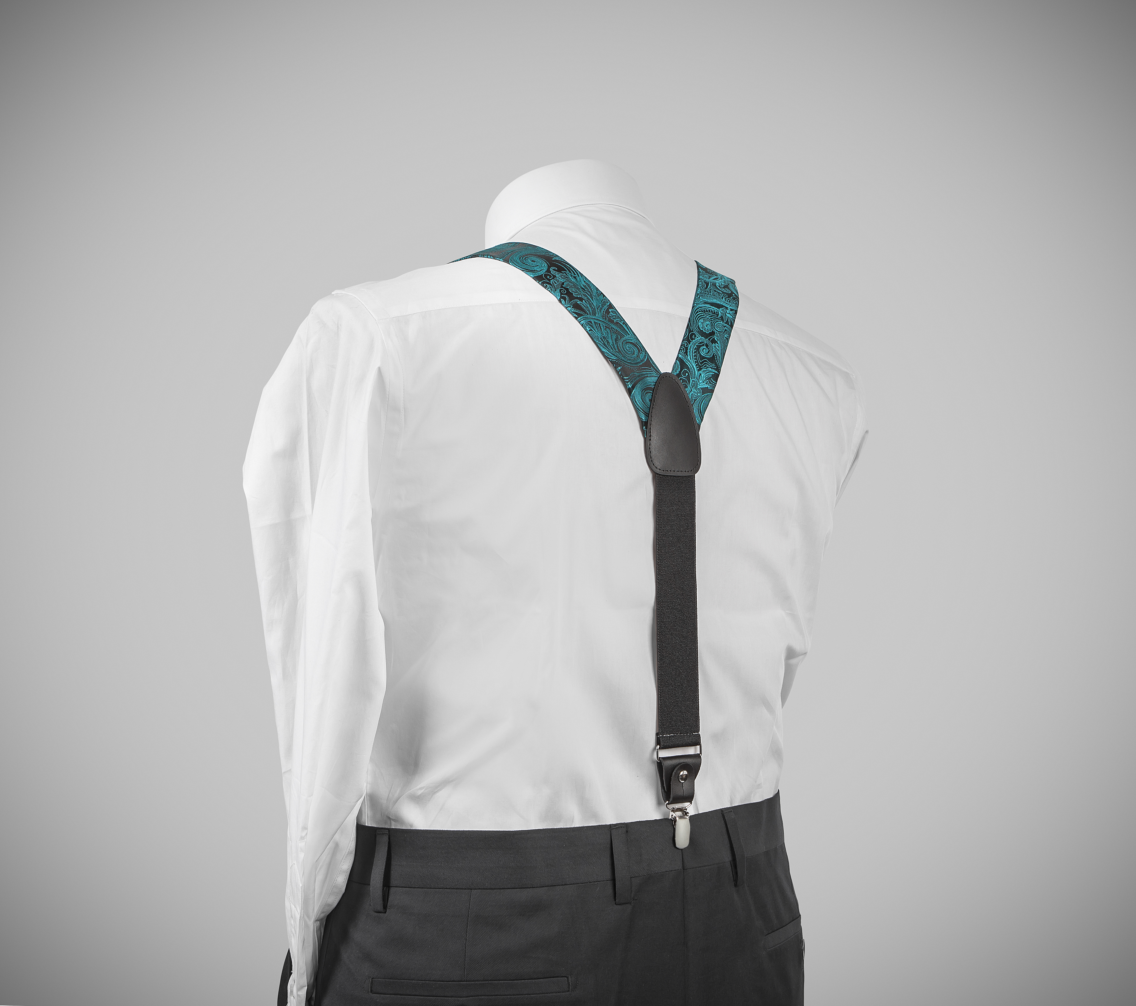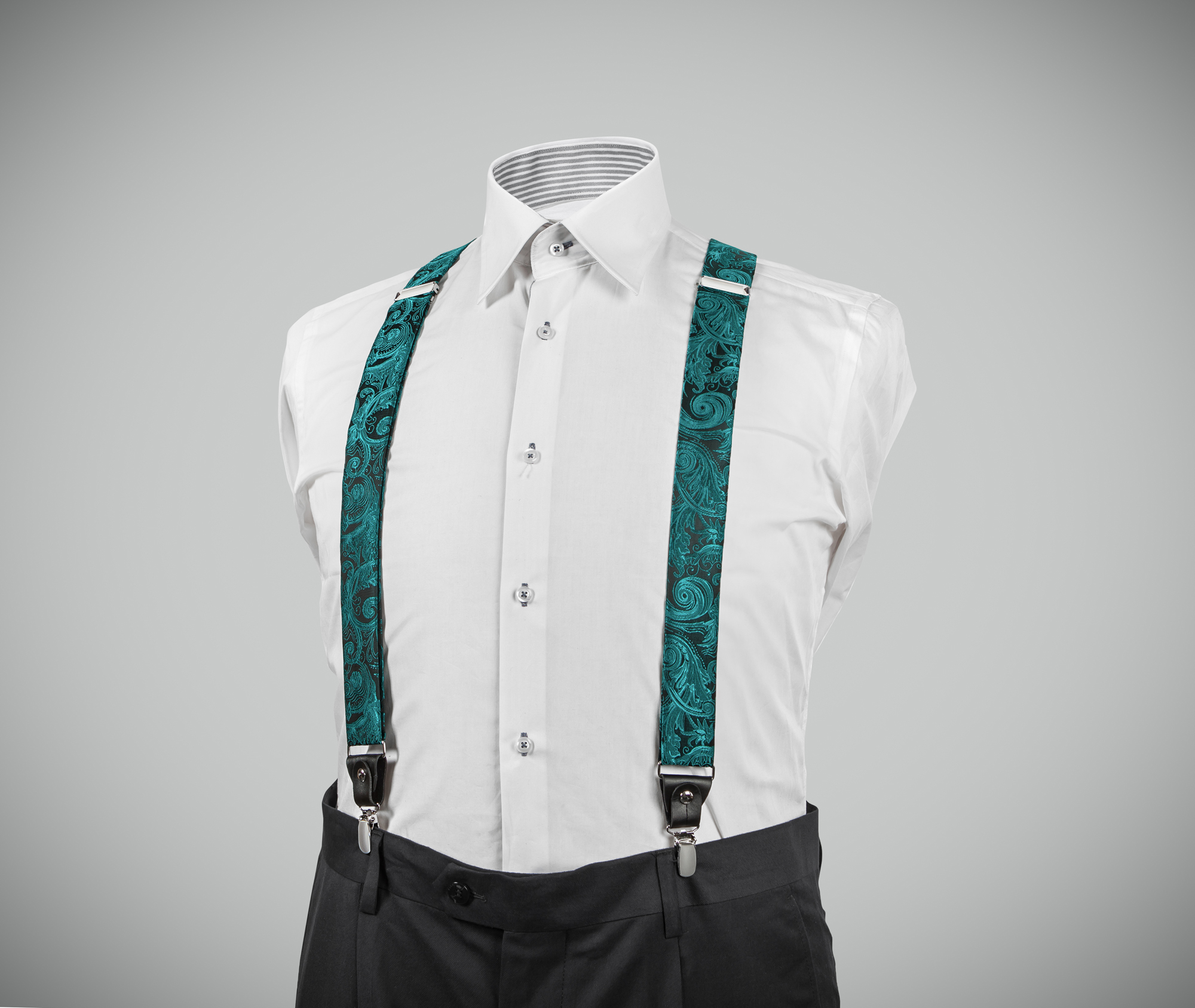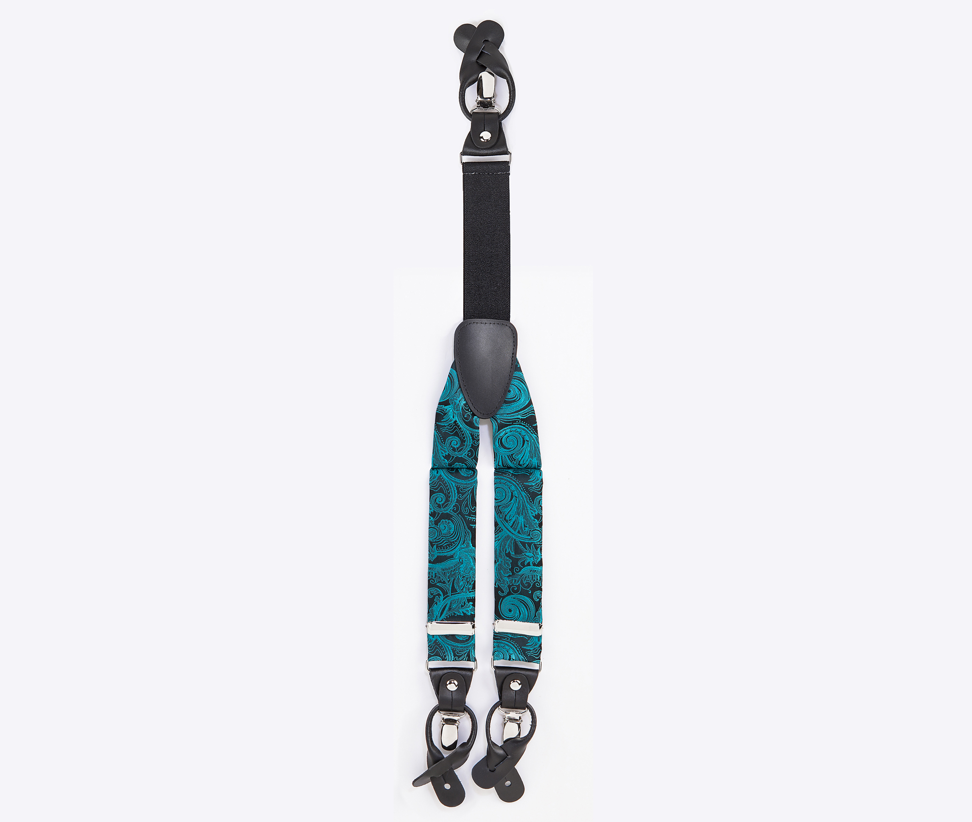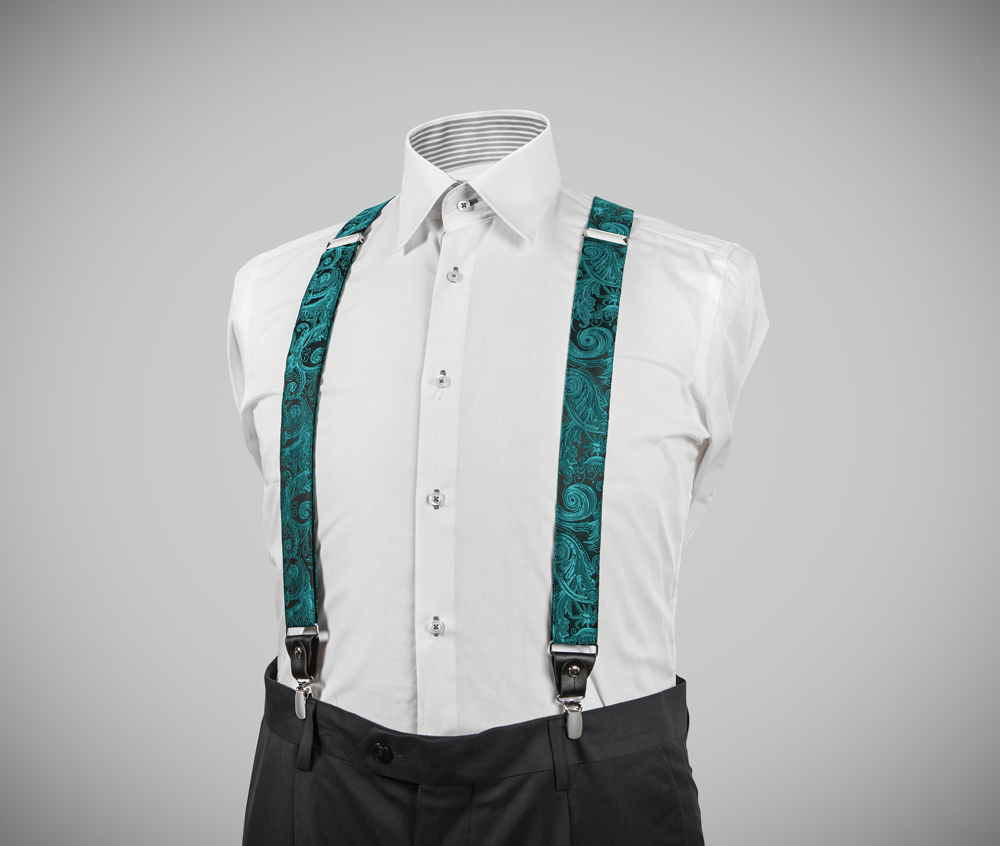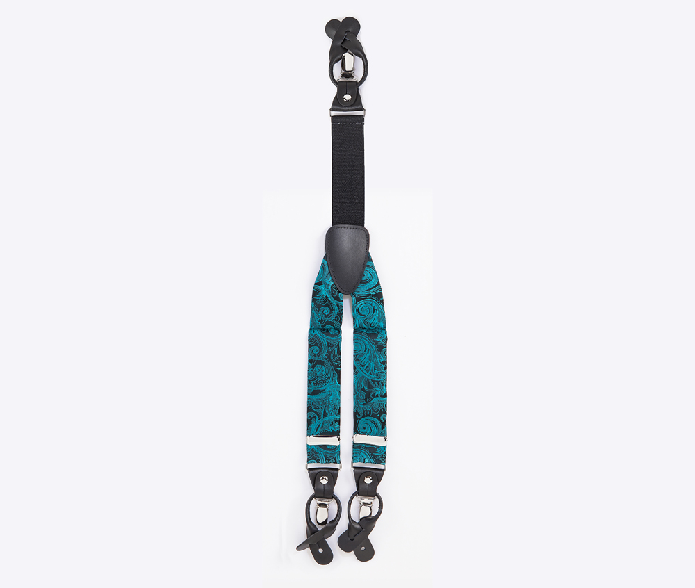 "Elegant, adjustable-size braces, 35mm width, released in exquisite micro woven, green-jade colour, with a lovely paisley finishing. Metal chrome clip and leather-strap button fasten, included."